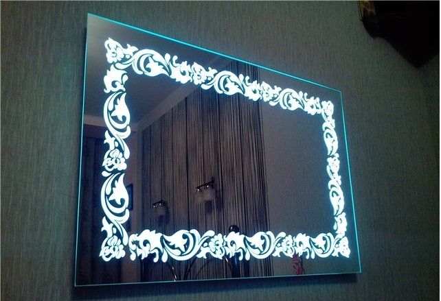 Сочетает функциональность зеркала и светильника. Изготовим полностью под ваши пожелания: цвет подсветки, выключатели, расположение и вид рисунка (по нашему каталогу или по вашему эскизу), цвет и форма профиля. Толщина всего 2-2.5 см